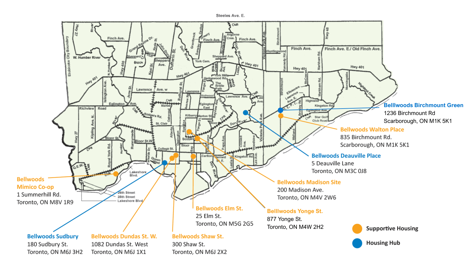 Bellwoods has six supportive housing sites. It owns two dedicated supportive housing buildings (1082 Dundas and 300 Shaw), and holds arrangements with four other housing providers offering supportive housing in Cooperative apartments, Toronto Community Housing buildings and in partnership with private housing developers. Units have varying levels of subsidy.
